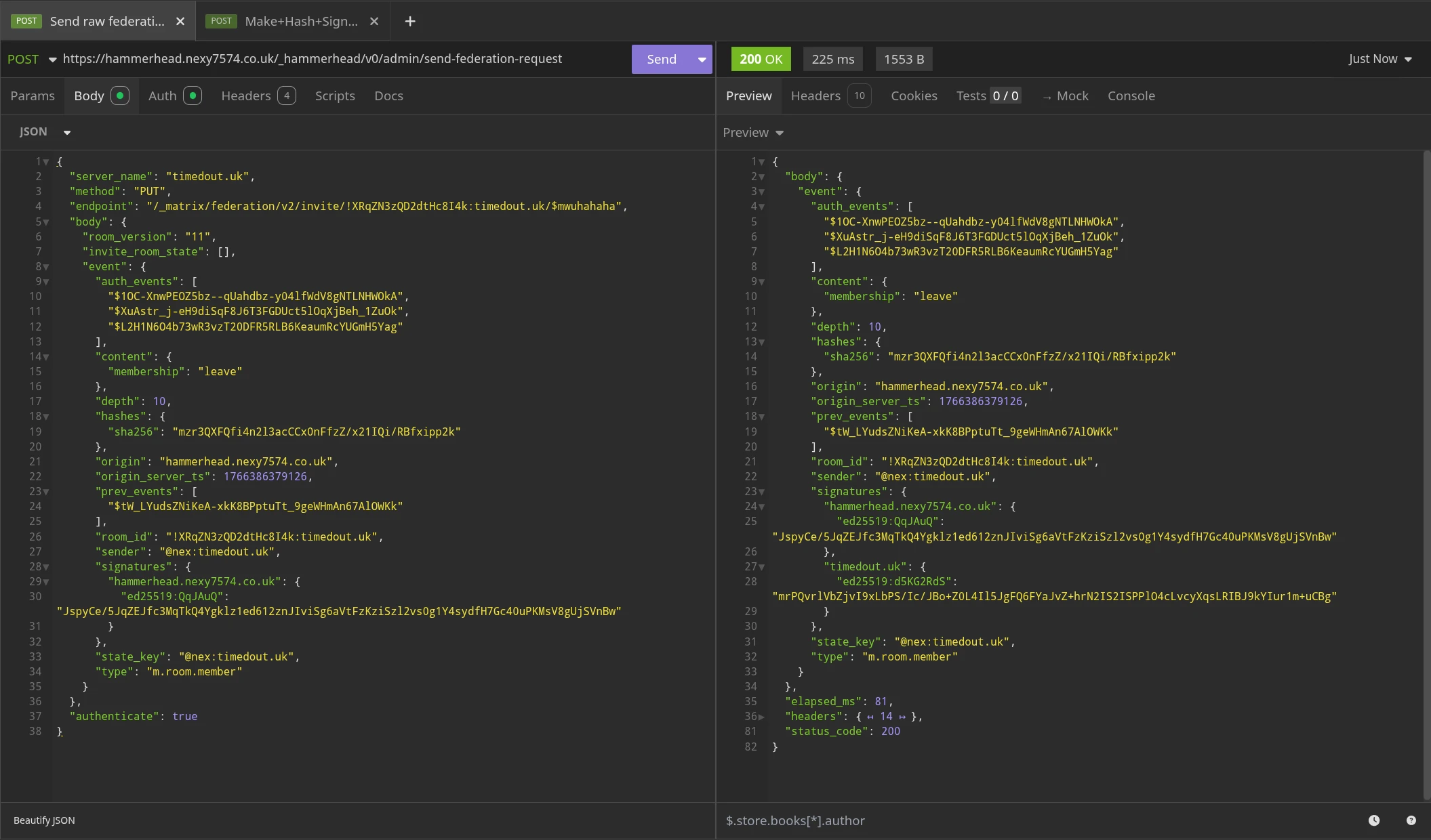 So, knowing now that each homeserver needs to sign events to verify their authenticity, and if they can’t produce a valid membership event locally, they need to ask a remote server, what do you think happened here (click to fullscreen):